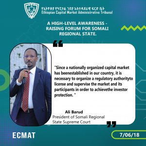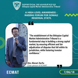 The Ethiopian Capital Market Administrative Tribunal (ECMAT) is conducting an awareness raising forum with higher officials, judges, and public prosecutors of Somali Regional State.